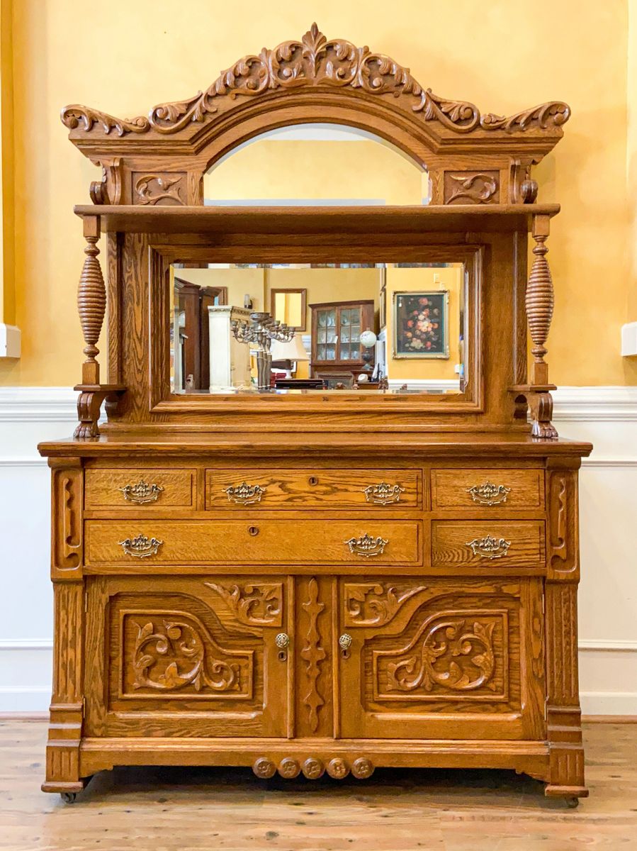 Antique Oak Large Ornate Mirror Back Sideboard American C.1900 Very well made.