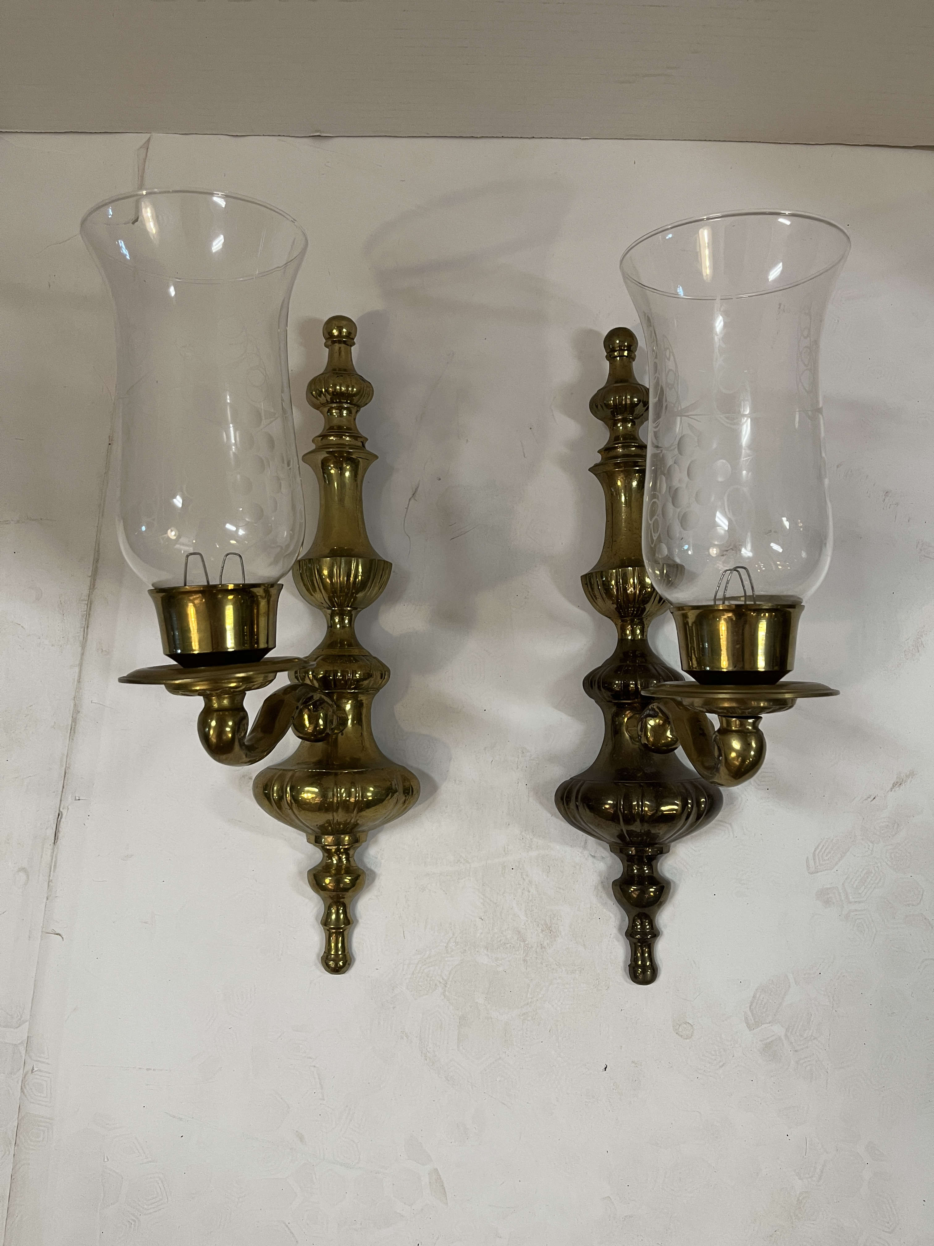 1940s Brass Wall Candle Sconces With Etched Glass Shades a Pair Very well made.